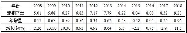 表1 2008~2018年我國粗鋼產(chǎn)量 單位:億噸