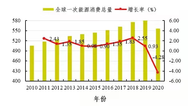 石油、天然氣、煤炭等化石燃料是目前人類活動(dòng)使用的最主要的能源消費(fèi)產(chǎn)品,同時(shí)也是全球二氧化碳等溫室氣體排放的主要貢獻(xiàn)者。根據(jù)2021年7月英國石油公司發(fā)布的《世界能源統(tǒng)計(jì)年鑒》(以下簡稱年鑒),2020年全球一次能源消費(fèi)量為556.63EJ(EJ=1018焦耳),受全球新冠肺炎疫情沖擊等因素影響,與2019年相比下降4.28個(gè)百分點(diǎn),為2009年以來首次出現(xiàn)一次能源消費(fèi)負(fù)增長。2010至2020年全球一次能源消費(fèi)總量及增長率變化情況如圖3所示。從圖中可以看出,自2012年以來,全球一次能源消費(fèi)增長速率放緩,2018年增速略有增加后2019年更緩,直至2020年出現(xiàn)負(fù)增長。