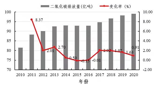 圖6  2010-2020年全球二氧化碳排放量及變化率