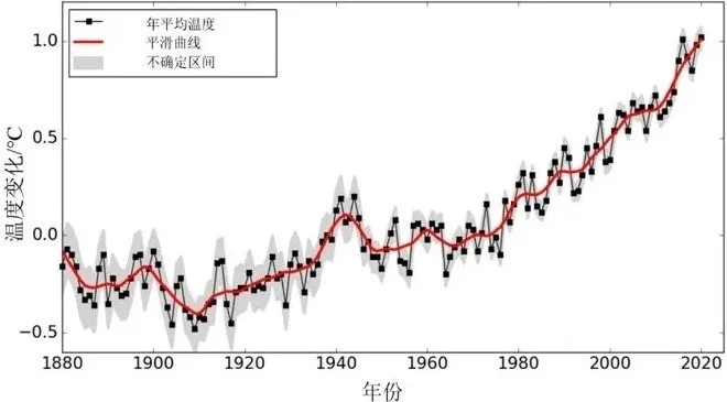 美國國家航空和航天局(NASA)戈達(dá)德空間研究所(Goddard Institute for Space Studies)開發(fā)了基于地理信息系統(tǒng)的全球地表溫度分析工具(GISS Surface Temperature Analysis)。利用該工具,可以得到自1880年以來全球年平均地表氣溫的變化情況(圖1),以及全球地表溫度季節(jié)性周期變化情況(圖2)。從圖中可以觀察到,1880至1980年百余年間,全球年平均地表氣溫總體波動(dòng)較小,處于溫度緩慢上漲和下降的小幅波動(dòng)相繼疊加狀態(tài)。1980年之后,全球年平均地表溫度呈現(xiàn)明顯的波動(dòng)上升趨勢,而且隨著時(shí)間的推移這種趨勢愈發(fā)明顯。同時(shí),2020年與工業(yè)化前相比,全球平均地表溫度已經(jīng)上升了1.2 ± 0.1 ℃。