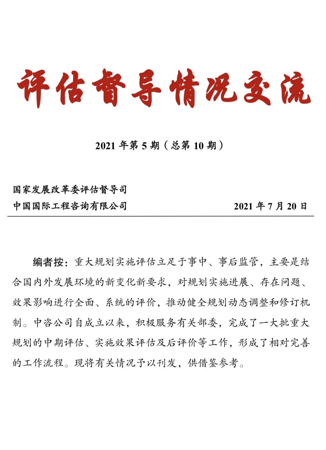 編者按:重大規(guī)劃實(shí)施評(píng)估立足于事中、事后監(jiān)管,主要是結(jié)合國(guó)內(nèi)外發(fā)展環(huán)境的新變化新要求,對(duì)規(guī)劃實(shí)施進(jìn)展、存在問題、效果影響進(jìn)行全面、系統(tǒng)的評(píng)價(jià),推動(dòng)健全規(guī)劃動(dòng)態(tài)調(diào)整和修訂機(jī)制。中咨公司自成立以來,積極服務(wù)有關(guān)部委,完成了一大批重大規(guī)劃的中期評(píng)估、實(shí)施效果評(píng)估及后評(píng)價(jià)等工作,形成了相對(duì)完善的工作流程?,F(xiàn)將有關(guān)情況予以刊發(fā),供借鑒參考。