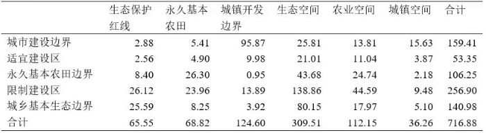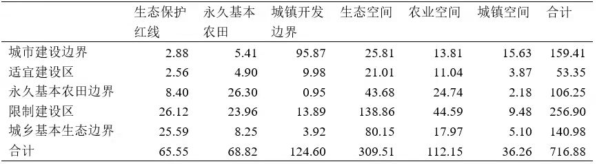 國(guó)土空間規(guī)劃的保護(hù)類(lèi)用地面積顯著大于城市規(guī)劃。按照“開(kāi)發(fā)—保護(hù)”的二元法劃分,城市規(guī)劃的開(kāi)發(fā)類(lèi)用地(城市建設(shè)邊界、適宜建設(shè)區(qū))的面積為212.76km2,保護(hù)類(lèi)用地(永久基本農(nóng)田邊界、限制建設(shè)區(qū)、城鄉(xiāng)生態(tài)邊界)面積504.12km2。國(guó)土空間規(guī)劃的開(kāi)發(fā)類(lèi)用地(城市開(kāi)發(fā)邊界、城鎮(zhèn)空間)的面積為160.86km2,保護(hù)類(lèi)(永久基本農(nóng)田、農(nóng)業(yè)空間、生態(tài)保護(hù)紅線、生態(tài)空間)用地面積556.02km2。城市規(guī)劃的保護(hù)類(lèi)用地面積比國(guó)土空間規(guī)劃少9.3%。在耕地保護(hù)方面,城市規(guī)劃的永久基本農(nóng)田邊界面積為106.25km2,小于國(guó)土空間規(guī)劃的永久基本農(nóng)田(68.82km2)、農(nóng)業(yè)空間面積(112.15km2)之和(合計(jì)180.97km2)。在生態(tài)保護(hù)方面,城市規(guī)劃的城鄉(xiāng)基本生態(tài)邊界(140.98 km2)、限制建設(shè)區(qū)(256.90km2)面積之和為397.88km2,與國(guó)土空間規(guī)劃的生態(tài)保護(hù)紅線(65.55km2)、生態(tài)空間(309.51km2)之和(合計(jì)375.06km2)基本持平。