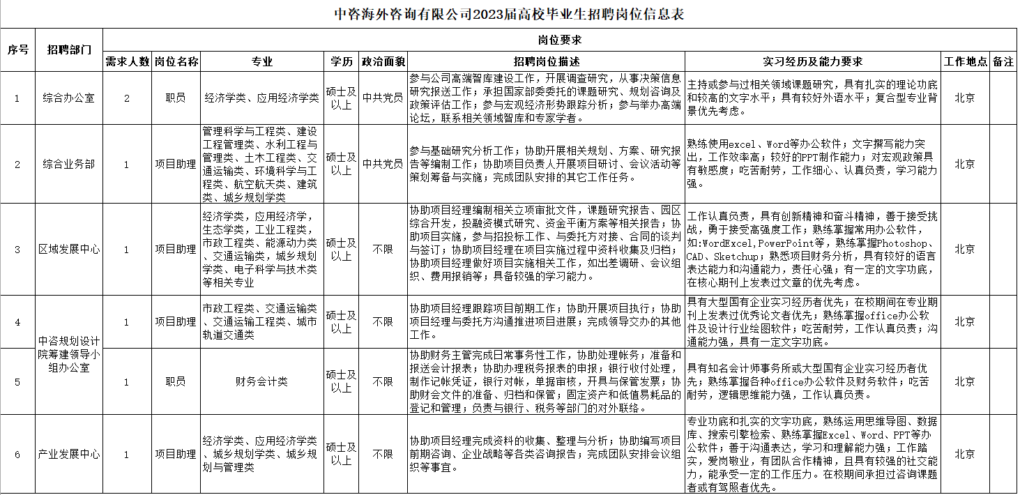 中咨海外咨詢有限公司2023屆高校畢業(yè)生招聘崗位信息表.pdf