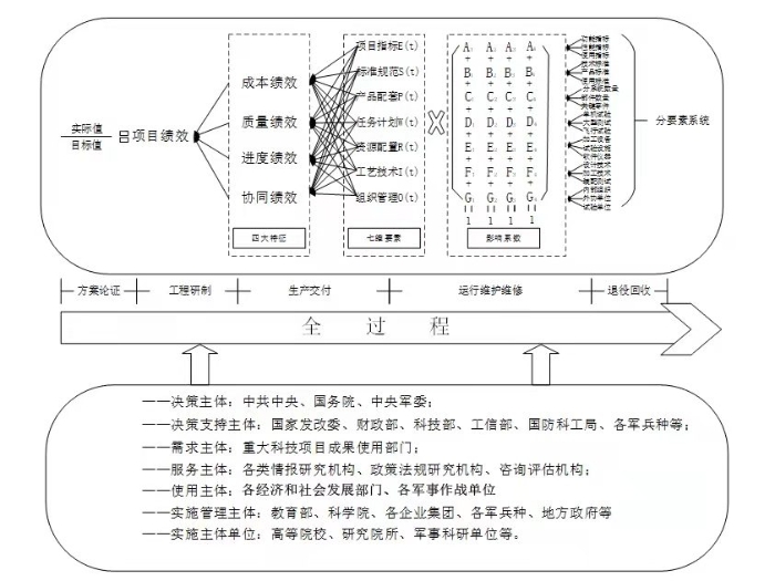基于基礎(chǔ)信息要素的重大科技工程項(xiàng)目全過程管理及績(jī)效評(píng)價(jià)研究 中國(guó)國(guó)際工程咨詢有限公司 武博祎 哈爾濱工程大學(xué) 陳茜、蘆翰晨、陳俊清 摘要:文章基于系統(tǒng)工程、綜合集成等相關(guān)理論,堅(jiān)持需求導(dǎo)向,從重大科技工程項(xiàng)目落實(shí)全要素、全過程軍民融合和協(xié)同創(chuàng)新,以及對(duì)重大科技工程項(xiàng)目實(shí)施科學(xué)和精細(xì)化管理出發(fā),將重大科技工程項(xiàng)目所表現(xiàn)和涉及的基礎(chǔ)要素按如下七個(gè)維度進(jìn)行劃分:項(xiàng)目技術(shù)指標(biāo)E(t)、項(xiàng)目標(biāo)準(zhǔn)規(guī)范S(t)、產(chǎn)品配套結(jié)構(gòu)P(t)、保障資源配置R(t)、制造工藝技術(shù)I(t)、項(xiàng)目任務(wù)計(jì)劃W(t)、組織管理效能O(t),并提出各維度要素及項(xiàng)目成本、質(zhì)量、進(jìn)度、協(xié)同四大特征與整個(gè)工程項(xiàng)目績(jī)效評(píng)價(jià)方法,以便實(shí)現(xiàn)重大科技工程項(xiàng)目全要素、全過程動(dòng)態(tài)集成管理和績(jī)效評(píng)價(jià),為科學(xué)決策提供支持。 關(guān)鍵詞:重大科技工程項(xiàng)目;要素;集成管理;績(jī)效評(píng)價(jià) 一、引言 為提升國(guó)家戰(zhàn)略實(shí)力,增強(qiáng)自身競(jìng)爭(zhēng)優(yōu)勢(shì),包括美國(guó)、俄羅斯、日本、印度、歐洲等國(guó)家和地區(qū)都積極組織實(shí)施集工程研制、科學(xué)研究和能力建設(shè)目標(biāo)為一體、軍民融合的重大科技工程項(xiàng)目。為實(shí)現(xiàn)我國(guó)戰(zhàn)略發(fā)展目標(biāo),國(guó)家2006年2月發(fā)布《國(guó)家中長(zhǎng)期科學(xué)和技術(shù)發(fā)展規(guī)劃綱要(2006-2020)》[1],確定了關(guān)系國(guó)計(jì)民生的16個(gè)重大專項(xiàng);2017年科技部啟動(dòng)了“科技創(chuàng)新2030-重大項(xiàng)目”,對(duì)重大科技工程項(xiàng)目進(jìn)行布局。這些重大科技工程項(xiàng)目的實(shí)施,對(duì)解決國(guó)家安全重大問題,推動(dòng)科技進(jìn)步,服務(wù)經(jīng)濟(jì)社會(huì)發(fā)展,提升產(chǎn)業(yè)整體競(jìng)爭(zhēng)力,增強(qiáng)綜合國(guó)力具有重大戰(zhàn)略意義。 重大科技工程項(xiàng)目是集科學(xué)層次理論研究與核心技術(shù)突破、技術(shù)層次資源集成與開發(fā)實(shí)施、工程層次產(chǎn)品(設(shè)施)研制于一體,且具有軍民融合屬性的復(fù)雜巨系統(tǒng)[2]。具有實(shí)施周期長(zhǎng)、投資大、領(lǐng)域廣、風(fēng)險(xiǎn)高等特點(diǎn),需要各參研參建單位資源共享、協(xié)同創(chuàng)新,各相關(guān)主體對(duì)項(xiàng)目涉及的要素進(jìn)行科學(xué)和精細(xì)化管理,才能完成項(xiàng)目既定目標(biāo),并使軍民融合和科技協(xié)同創(chuàng)新戰(zhàn)略得以貫徹落實(shí)。但從現(xiàn)實(shí)情況看,目前我國(guó)重大科技工程項(xiàng)目管理仍普遍采用上世紀(jì)50年代美國(guó)項(xiàng)目管理協(xié)會(huì)提出的項(xiàng)目管理方法,重點(diǎn)關(guān)注項(xiàng)目進(jìn)度、成本和質(zhì)量等中觀特征要素,對(duì)影響項(xiàng)目預(yù)算變化、進(jìn)度調(diào)整、質(zhì)量保證等問題,特別是項(xiàng)目深度軍民融合效能問題,缺乏有針對(duì)性的基礎(chǔ)信息要素分析和管理。因此,在國(guó)家要求在相關(guān)領(lǐng)域?qū)崿F(xiàn)全要素軍民融合深度發(fā)展的大背景下,如何在一定的約束條件下對(duì)重大科技工程項(xiàng)目組織實(shí)施科學(xué)、精細(xì)和動(dòng)態(tài)管理,并使其實(shí)現(xiàn)既定目標(biāo),是一個(gè)重要且急需解決的問題。 我國(guó)現(xiàn)行基于美國(guó)上世紀(jì)提出的項(xiàng)目管理理論制定的針對(duì)科技工程項(xiàng)目管理方法,一直以來對(duì)項(xiàng)目管理取得了積極的成效,但隨著人們認(rèn)知自然世界的不斷深入、所面臨問題的不斷變化、對(duì)重大科技工程項(xiàng)目管理要求的提高,需要有能夠全面、系統(tǒng)、量化、精細(xì)反映重大科技工程項(xiàng)目本質(zhì)運(yùn)動(dòng)狀態(tài)的管理方法,以便對(duì)項(xiàng)目實(shí)施的變化趨勢(shì)、項(xiàng)目目標(biāo)實(shí)現(xiàn)可能遇到的風(fēng)險(xiǎn)進(jìn)行準(zhǔn)確分析判斷,適應(yīng)管理的科學(xué)化、系統(tǒng)化、精準(zhǔn)化、協(xié)同化要求。因此,本文通過剖析重大科技工程項(xiàng)目基礎(chǔ)信息要素,構(gòu)建基于信息要素的績(jī)效評(píng)價(jià)體系,實(shí)現(xiàn)全要素、全過程的科學(xué)化、系統(tǒng)化、知識(shí)化、精準(zhǔn)化、準(zhǔn)實(shí)時(shí)動(dòng)態(tài)管理,具有一定的理論和實(shí)際應(yīng)用意義。 二、重大科技工程項(xiàng)目管理研究現(xiàn)狀 重大科技工程項(xiàng)目全要素、全過程管理研究目前處于起步階段,研究成果相對(duì)較少,研究的視角主要集中在從國(guó)家宏觀層面及微觀重大科技工程項(xiàng)目過程管理兩方面開展研究。 宏觀角度研究重大科技工程項(xiàng)目管理的目的在于為其培育較好環(huán)境,完善相關(guān)政策,優(yōu)化重大科技工程項(xiàng)目資源配置,推動(dòng)重大科技工程項(xiàng)目成功實(shí)施。國(guó)家為項(xiàng)目的實(shí)施能夠達(dá)到預(yù)期的目標(biāo),對(duì)