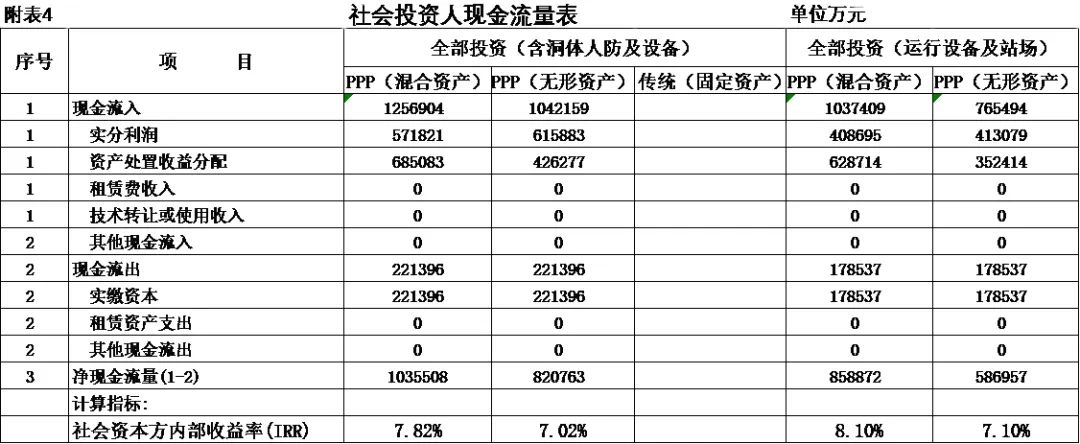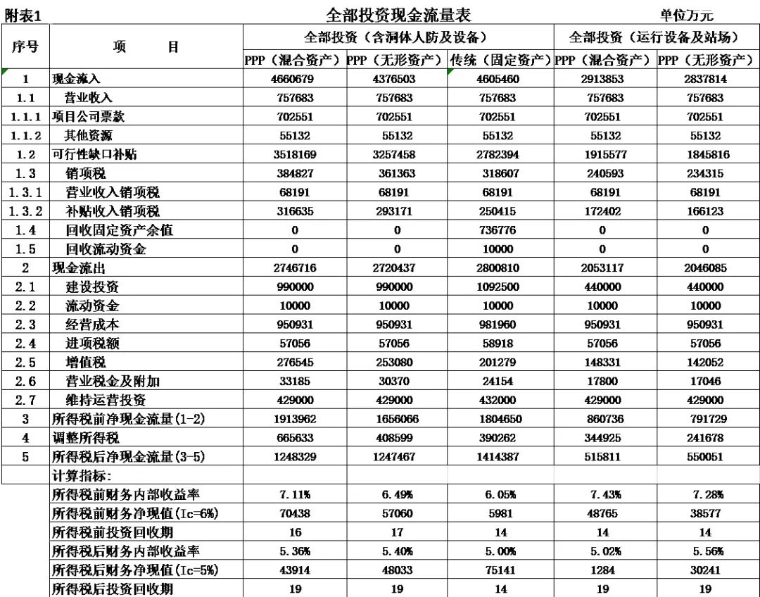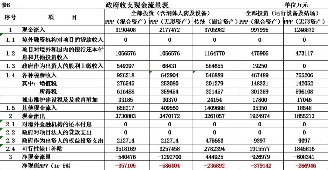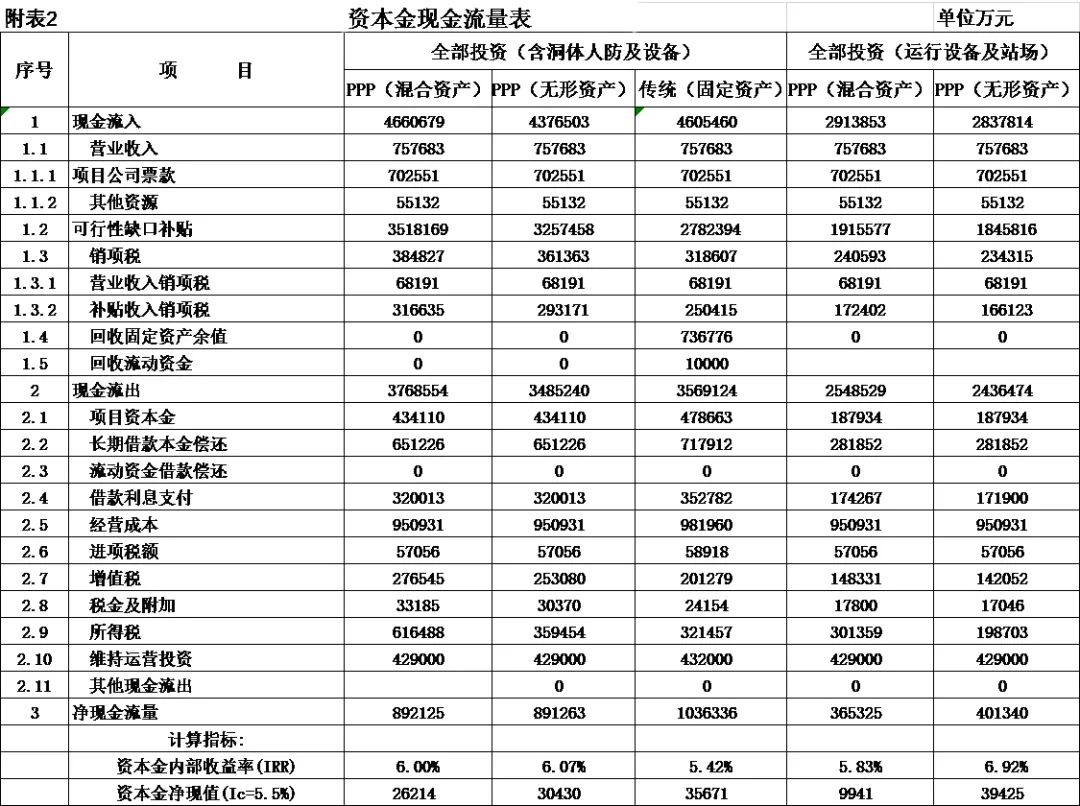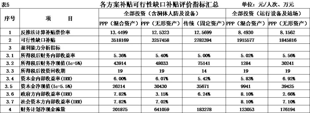 式中,Ct為項(xiàng)目包括投資在內(nèi)的各期費(fèi)用,一般為財(cái)務(wù)分析的投資、經(jīng)營(yíng)成本估算及維持運(yùn)營(yíng)投資,Qt為第t期的產(chǎn)出供應(yīng)消費(fèi)的量,i0為折現(xiàn)率。 2.反推價(jià)格中費(fèi)用取值 反推價(jià)格公式中的費(fèi)用可以利用全部投資現(xiàn)金流量表或資本金現(xiàn)金流量表中的現(xiàn)金流出量。本文推薦在PPP項(xiàng)目中,采用資本金現(xiàn)金流量表中的現(xiàn)金流出計(jì)算反推價(jià)格,原因是資本金財(cái)務(wù)基準(zhǔn)收益率是投資者期望的目標(biāo)收益率,采用資本金現(xiàn)金流出量反推的價(jià)格,計(jì)算的補(bǔ)貼額可直接達(dá)到投資者期望的收益目標(biāo),同時(shí)也可滿(mǎn)足全部投資所得稅后財(cái)務(wù)內(nèi)部收益率指標(biāo)。 3.反推價(jià)格折現(xiàn)率取值 反推價(jià)格折現(xiàn)率取值可以適當(dāng)取值偏高一些,需要反復(fù)試算,選取合理折現(xiàn)率。 方案Ⅰ反推價(jià)格選取按折現(xiàn)率7%,計(jì)算結(jié)果,反推價(jià)格為13.4499元/人次,計(jì)算過(guò)程見(jiàn)表3。 4.可行性缺口補(bǔ)助計(jì)算過(guò)程 (1)反推價(jià)格(P=13.4499元/人.次); (2)利用反推價(jià)格和可研報(bào)告的產(chǎn)品(或服務(wù))數(shù)量計(jì)算達(dá)到目標(biāo)收益率的收入總量,見(jiàn)表3序號(hào)2,計(jì)算票款收入41.22億元(該項(xiàng)收入為原運(yùn)營(yíng)收入和需要補(bǔ)貼收入之和); (3)目標(biāo)收入總量減去原票款收入,計(jì)算需要補(bǔ)貼數(shù)額,見(jiàn)表3序號(hào)3,計(jì)算補(bǔ)貼收入(補(bǔ)貼票款收入與原票款收入之差(2.1-1.1))34.19億元; (4)計(jì)算金融資產(chǎn)保底收入與利息收入之和,見(jiàn)表3序號(hào)4(4.1+4.1)232.39億元; (5)調(diào)整補(bǔ)貼收入,當(dāng)有些年序中補(bǔ)貼票款收入與原票款收入之差小于零時(shí),需要調(diào)整補(bǔ)貼收入,令其補(bǔ)貼收入等于當(dāng)年的金融資產(chǎn)保底收入與利息收入之和,見(jiàn)表3序號(hào)5,9.9億元; (6)補(bǔ)貼收入,見(jiàn)表3序號(hào)6,351.82億元。 (三)財(cái)務(wù)分析指標(biāo)匯總 各方案可行性缺口補(bǔ)貼及評(píng)價(jià)指標(biāo)匯總見(jiàn)表5。 (四)政府收支現(xiàn)金流量分析 政府收支現(xiàn)金流量表見(jiàn)表6。 (五)五方案數(shù)據(jù)對(duì)比分析的兩點(diǎn)啟示 數(shù)據(jù)對(duì)比分析結(jié)果的啟示: 啟示一:采用PPP模式要合理界定項(xiàng)目的范圍?;A(chǔ)設(shè)施項(xiàng)目投資結(jié)構(gòu)中純公益性設(shè)施投資占有較大比重的項(xiàng)目不適宜將全部投資納入PPP模式,建議將純公益性設(shè)施與運(yùn)營(yíng)設(shè)施分開(kāi)處理,兩部分投資可選擇不同的運(yùn)作模式。 第一組案例,PPP模式方案Ⅰ和方案Ⅱ與政府自建的傳統(tǒng)模式方案Ⅲ相比: 方案Ⅰ和方案Ⅱ根據(jù)特許經(jīng)營(yíng)協(xié)議規(guī)定的績(jī)效考核標(biāo)準(zhǔn),兩方案投資、經(jīng)營(yíng)成本及更新改造投資均比傳統(tǒng)模式政府自建成本節(jié)約10%左右。表5財(cái)務(wù)指標(biāo)計(jì)算結(jié)果可行性缺口補(bǔ)貼,方案Ⅰ為351.82億元,方案Ⅱ?yàn)?25.75萬(wàn)元,方案Ⅲ為278.24億元。方案Ⅲ比方案Ⅰ節(jié)約73.43億元,比方案Ⅱ節(jié)約47.51億元。表6政府現(xiàn)金收支流量分析結(jié)果,方案Ⅲ政府收支凈現(xiàn)值(ic=5%)為最小-23.69億元,比方案Ⅰ-35.71億元,減少12.02億元, 比方案Ⅱ-58.64億元,減少34.95億元。 為什么傳統(tǒng)模式方案Ⅲ在投資規(guī)模、經(jīng)營(yíng)成本、更新改造投資均高出兩方案10%左右的情況下,而財(cái)務(wù)指標(biāo)優(yōu)于PPP模式?主要原因有兩個(gè): 一是,地鐵項(xiàng)目投資結(jié)構(gòu)分為兩部分,洞體工程為地鐵運(yùn)營(yíng)提供了運(yùn)輸空間,屬于純公益性質(zhì),且投資占比在60%左右,而投資占比40%左右的營(yíng)運(yùn)設(shè)施,則屬于經(jīng)營(yíng)性。在傳統(tǒng)項(xiàng)目實(shí)施方案中洞體及人防土建工程按80-100年提取折舊,在25年內(nèi)固定資產(chǎn)提取折舊57.89億元,回收固定資產(chǎn)余值54.93億元。而選擇PPP模式時(shí),洞體及人防建設(shè)成本在25年項(xiàng)目公司全部回收,顯然運(yùn)營(yíng)期增加了政府補(bǔ)貼額。 二是,政府自建模式方案Ⅲ,不存在對(duì)社會(huì)資本補(bǔ)貼收益的支出。政府自建模式的缺點(diǎn)是初始投資大,建設(shè)及運(yùn)營(yíng)風(fēng)險(xiǎn)全部由政府承擔(dān)。 啟示二:確認(rèn)PPP模式資產(chǎn)性質(zhì)、設(shè)置保底量及合理分擔(dān)政府與社會(huì)投資人的風(fēng)險(xiǎn),直接影響可行性缺口補(bǔ)貼的計(jì)算結(jié)果。 第一組案例是全部投資(含洞體及人防工程投資)條件下的PPP模式,方案Ⅰ為混合資產(chǎn),方案Ⅱ?yàn)闊o(wú)形資產(chǎn)(不再詳述)。 第二組案例扣除洞體及人防工程投資,方案Ⅳ混合資產(chǎn),方案Ⅴ無(wú)形資產(chǎn)。以下本文重點(diǎn)分析第二組方案PPP模式方案Ⅳ混合資產(chǎn)定性的過(guò)程。 方案Ⅳ和方案Ⅴ是扣除洞體及人防土建工程投資的PPP項(xiàng)目,項(xiàng)目總投資42.46億元,資本金18.79億元,政府出資5%,為0.93億元,社會(huì)出資人出資95%,為17.85億元。方案Ⅳ資產(chǎn)性質(zhì)為混合資產(chǎn),方案Ⅴ資產(chǎn)性質(zhì)為無(wú)