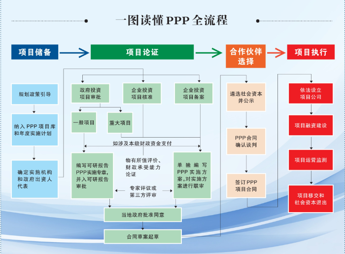 基礎(chǔ)設(shè)施領(lǐng)域PPP項(xiàng)目周期一般包括項(xiàng)目?jī)?chǔ)備、項(xiàng)目論證、合作伙伴選擇及項(xiàng)目執(zhí)行等階段,每個(gè)階段涉及多項(xiàng)步驟。具體到水利基礎(chǔ)設(shè)施PPP項(xiàng)目操作,需要關(guān)注以下重點(diǎn)。