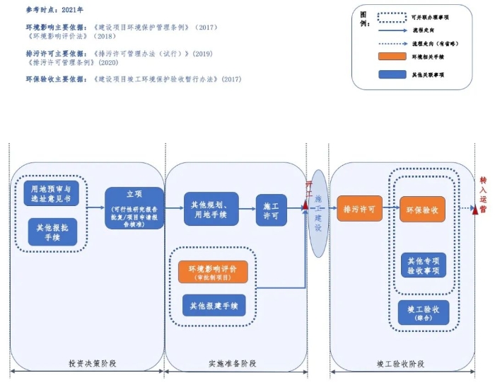 當前我國基礎設施項目在環(huán)境方面前期工作主要包括環(huán)境影響評價排污許可等相關手續(xù),此外,在工程項目的竣工驗收階段,還包括環(huán)保方面的專項驗收等。