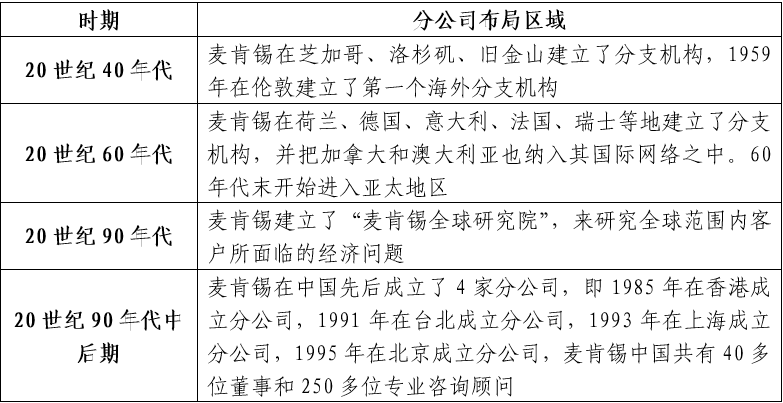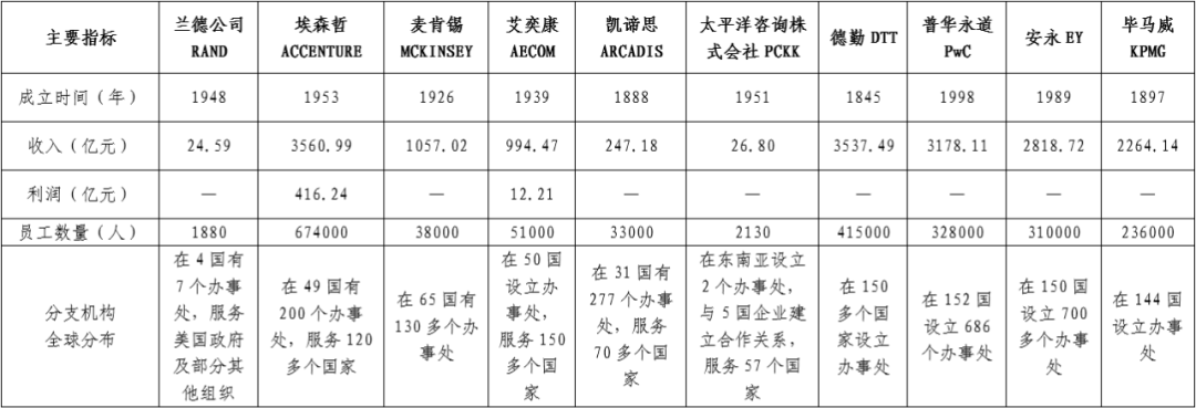 (三)研究思路 重點(diǎn)圍繞經(jīng)營(yíng)規(guī)模、全球戰(zhàn)略布局、集團(tuán)化發(fā)展、數(shù)字化發(fā)展、人才培養(yǎng)等方面開(kāi)展對(duì)比研究,為中咨公司打造世界一流咨詢機(jī)構(gòu)提出初步的方向性戰(zhàn)略構(gòu)想,更好地服務(wù)公司高質(zhì)量發(fā)展總體戰(zhàn)略。充分發(fā)揮龍頭示范作用,加強(qiáng)精細(xì)化管理,全面提升核心競(jìng)爭(zhēng)力,助力中咨公司加快建設(shè)成為國(guó)內(nèi)有權(quán)威、國(guó)際有影響的國(guó)家高端智庫(kù)、世界一流咨詢機(jī)構(gòu),體現(xiàn)智庫(kù)型中央企業(yè)的使命擔(dān)當(dāng)。 二、經(jīng)營(yíng)規(guī)?,F(xiàn)狀分析 (一)對(duì)比企業(yè)經(jīng)營(yíng)規(guī)模情況 1.智庫(kù)型企業(yè) 蘭德公司(RAND)是全球頂級(jí)智庫(kù)型企業(yè)之一。蘭德公司成立于1948年,總部設(shè)在美國(guó)加利福尼亞州的圣莫尼卡,是國(guó)際最知名的非營(yíng)利性的研究機(jī)構(gòu)之一,被譽(yù)為現(xiàn)代智囊的“大腦集中營(yíng)”“超級(jí)軍事學(xué)院”,致力于以嚴(yán)謹(jǐn)?shù)姆治鲅芯縼?lái)推進(jìn)決策與政策制定。擁有來(lái)自50多個(gè)國(guó)家的1880多名員工,半數(shù)以上的研究人員持有一個(gè)或多個(gè)博士學(xué)位,在2020年全球頂級(jí)智庫(kù)綜合榜單中排名第七,2021年總收入為24.59億元(折人民幣)。 業(yè)務(wù)領(lǐng)域范圍較廣。蘭德公司資金來(lái)源廣泛,目前軍隊(duì)、政府的資助仍然超過(guò)一半以上。蘭德公司主要為美國(guó)軍方、美國(guó)政府機(jī)構(gòu)、基金會(huì)、高校以及私營(yíng)企業(yè)等提供咨詢服務(wù),研究領(lǐng)域主要涉及軍事科技、國(guó)家安全、國(guó)際事務(wù)、公共安全、法律與商業(yè)、教育、健康、基礎(chǔ)設(shè)施、交通、能源、環(huán)境、網(wǎng)絡(luò)通訊、數(shù)據(jù)科學(xué)、社會(huì)公平等。 2.管理咨詢企業(yè) 埃森哲(ACCENTURE)。埃森哲成立于1953年,是一家全球領(lǐng)先的專業(yè)服務(wù)公司,在數(shù)字化、云計(jì)算與網(wǎng)絡(luò)安全領(lǐng)域擁有全球領(lǐng)先的能力。埃森哲秉承“科技融靈智,匠心承未來(lái)”的企業(yè)使命,致力于通過(guò)引領(lǐng)變革創(chuàng)造價(jià)值,為客戶、員工、股東、合作伙伴與整個(gè)社會(huì)創(chuàng)造美好未來(lái)。埃森哲憑借獨(dú)特的業(yè)內(nèi)經(jīng)驗(yàn)與專業(yè)技能,以及翹楚全球的卓越技術(shù)中心和智能運(yùn)營(yíng)中心,為客戶提供戰(zhàn)略和咨詢、互動(dòng)體驗(yàn)、技術(shù)服務(wù)和智能運(yùn)營(yíng)等全方位服務(wù),業(yè)務(wù)涵蓋40多個(gè)行業(yè),以及企業(yè)日常運(yùn)營(yíng)部門的各個(gè)職能。埃森哲是《財(cái)富》全球500強(qiáng)企業(yè)之一,在全球49個(gè)國(guó)家設(shè)立了200多個(gè)辦事處,服務(wù)于120多個(gè)國(guó)家的客戶,擁有674000多名員工,2021年總收入為3560.99億元(折人民幣)。 麥肯錫(MCKINSEY)。麥肯錫成立于1926年,其定位是幫助領(lǐng)先的企業(yè)機(jī)構(gòu)實(shí)現(xiàn)顯著、持久的經(jīng)營(yíng)業(yè)績(jī)改善,打造能夠吸引、培育和激勵(lì)杰出人才的優(yōu)秀組織機(jī)構(gòu)。主營(yíng)業(yè)務(wù)是為客戶特別是企業(yè)設(shè)計(jì)、制定相配套的一體化解決方案,包括戰(zhàn)略開(kāi)發(fā)、經(jīng)營(yíng)運(yùn)作、組織結(jié)構(gòu)等,業(yè)務(wù)范圍涉及汽車、銀行、能源、保健、保險(xiǎn)、制造、公共事業(yè)、零售、電信和交通等領(lǐng)域。目前擁有來(lái)自80多個(gè)國(guó)家38000多名員工,2021年總收入為1057.02億元(折人民幣)。 德勤(DTT)。德勤成立于1845年,是全球領(lǐng)先的專業(yè)服務(wù)機(jī)構(gòu),世界四大會(huì)計(jì)師事務(wù)所之一。德勤品牌連續(xù)第四年被Brand Finance(品牌金融)評(píng)為全球最具影響力及最具價(jià)值商業(yè)服務(wù)品牌,入選全球最佳雇主榜單,為近90%的《財(cái)富》全球500強(qiáng)企業(yè)以及數(shù)千家民營(yíng)企業(yè)提供專業(yè)服務(wù)。德勤業(yè)務(wù)范圍包括審計(jì)和鑒證、稅務(wù)和法律、咨詢、財(cái)務(wù)咨詢和風(fēng)險(xiǎn)咨詢服務(wù)等,涉及消費(fèi)品行業(yè)、能源、資源與工業(yè)、金融服務(wù)、政府與公共服務(wù)、生命科學(xué)與醫(yī)療保健、技術(shù)、媒體與電信等領(lǐng)域。德勤在全球150多個(gè)國(guó)家設(shè)立辦事處,擁有415000多名員工,2021年總收入為3537.49億元(折人民幣)。 普華永道(PwC)。普華永道成立于1998年,是一家致力于“在社會(huì)中建立信任并解決重要問(wèn)題”的全球?qū)I(yè)服務(wù)聯(lián)盟組織。在中國(guó)注冊(cè)會(huì)計(jì)師協(xié)會(huì)《2021年度會(huì)計(jì)師事務(wù)所綜合評(píng)價(jià)百家排名信息》中,普華永道連續(xù)第十九年(2003年~2021年)蟬聯(lián)該項(xiàng)排名第一。普華永道主營(yíng)業(yè)務(wù)包括戰(zhàn)略變革,流程優(yōu)化和技術(shù)解決方案等,業(yè)務(wù)范圍涉及航空航天、國(guó)防與安全、汽車、資本項(xiàng)目和基礎(chǔ)設(shè)施、消費(fèi)市場(chǎng)、能源、公用事業(yè)和資源、工程與建筑、金融服務(wù)、政府和公共服務(wù)、醫(yī)療、酒店與休閑、工業