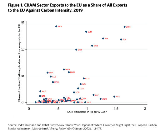評估一個國家脆弱性的另一個重要指標(biāo)是其經(jīng)濟(jì)的碳強(qiáng)度。根據(jù) CBAM,碳稅將取決于進(jìn)口商品中的碳含量。如果兩個國家向歐盟出口相同數(shù)量的 CBAM 商品,則其行業(yè)碳強(qiáng)度之間的差異可能是影響稅收負(fù)擔(dān)并最終影響這些行業(yè)競爭力的決定性因素。研究人員Indra Overland 和 Rahat Sabyrbekov 于2022 年開展的一項研究繪制了各國對歐盟的 CBAM 部門出口占其對歐盟總出口的份額與其碳強(qiáng)度的關(guān)系(見圖 1)。在歐盟的貿(mào)易伙伴中,2019 年碳密集度最高的經(jīng)濟(jì)體是烏克蘭、伊朗、哈薩克斯坦、波斯尼亞和黑塞哥維那以及越南。與此同時,烏克蘭、塞爾維亞和巴林的碳強(qiáng)度較高,也是對歐盟出口依賴度較高的國家。