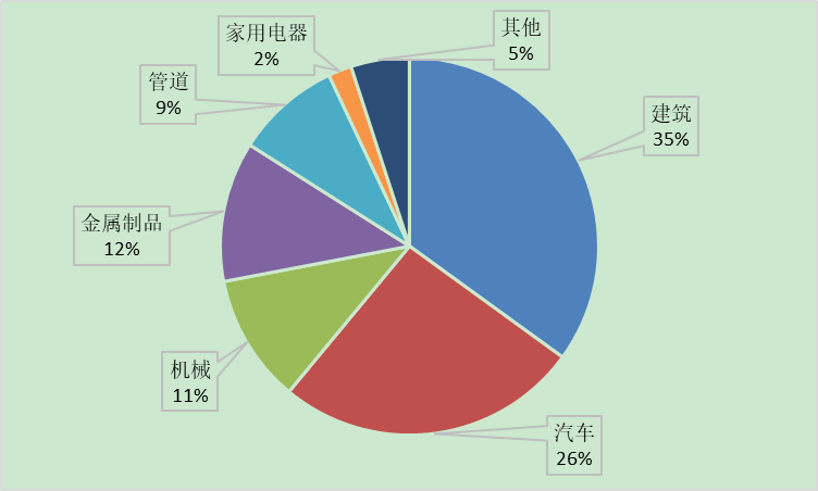 2021年,德國鋼材表觀消費量約3520萬噸,建筑行業(yè)、汽車工業(yè)、金屬制品、機械工業(yè)是鋼鐵消費量最多的領域,分別占鋼材消費量的35%、26%、12%、11%。
