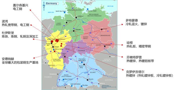 作為傳統(tǒng)板塊,鋼鐵始終是蒂森克虜伯的核心業(yè)務。從產(chǎn)品結(jié)構(gòu)看,蒂森克虜伯聚焦鋼鐵板材,產(chǎn)品包括熱軋板帶、冷軋板帶、電工鋼、鍍鋅板等。從生產(chǎn)布局看,生產(chǎn)單元集中在北萊茵-威斯特法倫州,形成了以杜伊斯堡為中心的區(qū)域化生產(chǎn)布局。