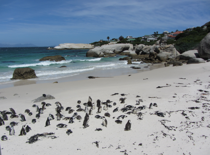 企鵝灘保護(hù)區(qū)位于開普敦西蒙鎮(zhèn)的博德斯海灘(Boulders Beach)。這里的企鵝身材瘦小,喙前端有一圈淡白色的圓環(huán),整個(gè)足部以下全為黑色,只在非洲大陸南端的開普敦海域出現(xiàn),故名斑嘴環(huán)企鵝、黑足企鵝、非洲小企鵝。1910年時(shí)非洲企鵝約有150萬只,上世紀(jì)初期開普敦附近水域數(shù)起沉船漏油事件污染了企鵝的居住地,使得大部分企鵝死亡,只剩下不到原數(shù)量7%的非洲小企鵝得以生存與繁殖。1982年,2只非洲小企鵝來到博德斯海灘安家,當(dāng)?shù)鼐用褡园l(fā)進(jìn)行保護(hù),1983年,建立博德斯企鵝保護(hù)區(qū)。到2005年,這里的企鵝數(shù)量已達(dá)到3900只。受棲息地破壞、原油泄漏和其他海洋污染、氣候變暖導(dǎo)致魚群變遷及本地動(dòng)物的傷害、過度捕撈、大量旅游活動(dòng)沖突等因素影響,到2011年,保護(hù)區(qū)內(nèi)還剩下2100只企鵝。目前又逐漸恢復(fù)到3000多只[2]。