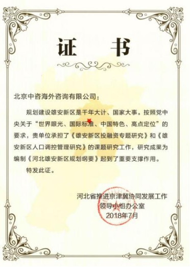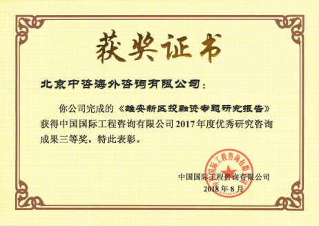 有志者事竟成。中咨海外公司交出了一份滿意答卷,獲得河北省委省政府的充分肯定,為《河北雄安新區(qū)規(guī)劃綱要》(2018年4月14日中共中央、國務(wù)院批復(fù))的編制起到重要支撐作用,加快推動新區(qū)投融資政策創(chuàng)新集成,建立新區(qū)長期穩(wěn)定的資金籌措機制,整體提高新區(qū)資金統(tǒng)籌能力,為雄安新區(qū)未來發(fā)展作出重要貢獻。研究成果獲得“中咨公司優(yōu)秀咨詢成果三等獎”及“全國優(yōu)秀工程咨詢成果一等獎”。