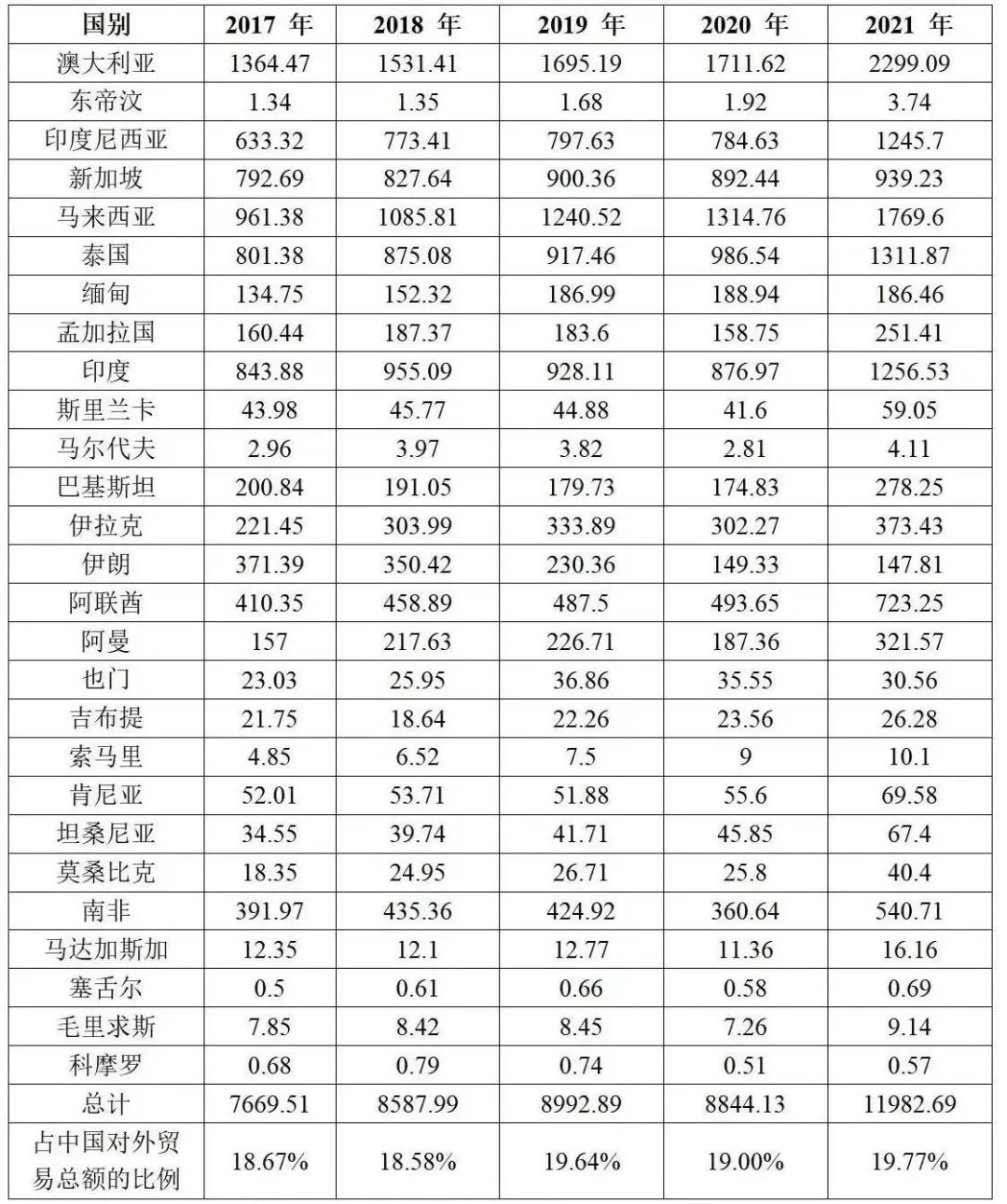 表1 2017-2021 年中國(guó)與印度洋沿岸各國(guó)貿(mào)易額 (單位:億美元)