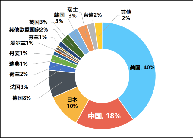 通過(guò)對(duì)2022年全球主要國(guó)家和地區(qū)企業(yè)研發(fā)投入占比分析可以看出,美國(guó)最高,約為40%,我國(guó)約為18%,研發(fā)投入方面存在一定差距。