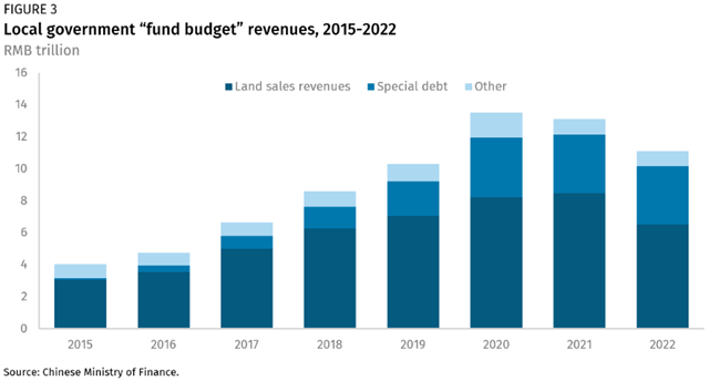 “新基建”和政府贈(zèng)款基金由地方政府通過(guò)政府專項(xiàng) “基金預(yù)算”提供資金(圖 3)。這些預(yù)算依賴于土地收入和債務(wù),因此與過(guò)去的預(yù)算資金相比受到的限制較少。2021年至2022年 ,土地出讓收入下降了23%,而不可持續(xù)的債務(wù)水平和不斷上升的利息支出限制了地方政府利用更多債務(wù)為新項(xiàng)目融資的能力。即使在廣東和江蘇這樣的發(fā)達(dá)省份,2015年至2021 年間,相關(guān)利息支出占公共收入的比重也分別增長(zhǎng)了30%和25%,分別占財(cái)政收入的5.4%和7.3%。