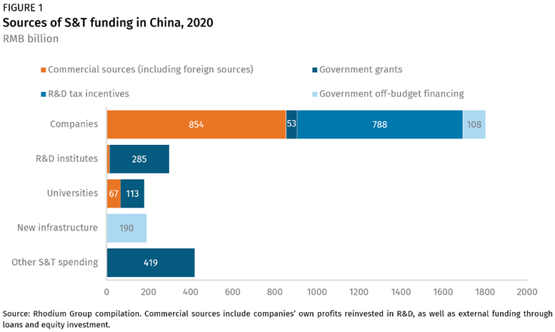 與世界其他地方一樣,中國(guó)創(chuàng)新生態(tài)系統(tǒng)的資金來(lái)自各種商業(yè)和公共來(lái)源,并流向廣泛的公共和私人科技行為者。然而,與其他大型和技術(shù)發(fā)達(dá)的經(jīng)濟(jì)體相比,政府相關(guān)來(lái)源在中國(guó)發(fā)揮著主導(dǎo)作用,約占流入中國(guó)科技生態(tài)系統(tǒng)的所有資金的60%(見(jiàn)圖1)。
