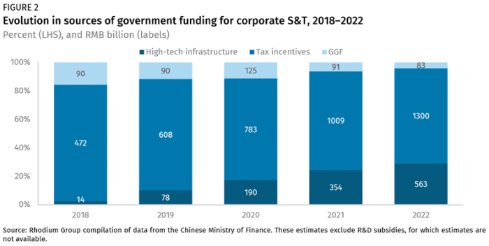 過(guò)去十年間,政府還通過(guò)補(bǔ)貼和稅收優(yōu)惠,以及股權(quán)融資和高科技基礎(chǔ)設(shè)施等間接手段,加大了對(duì)企業(yè)研發(fā)的支持力度(圖 2)。所有資金來(lái)源都實(shí)現(xiàn)了快速增長(zhǎng),但僅稅收返還一項(xiàng)在2018年至2022年間的年均增長(zhǎng)率就高達(dá) 28.8%,成為政府為企業(yè)研發(fā)提供資金的最大來(lái)源,到2022年將達(dá)到1.3萬(wàn)億元人民幣(1933億美元)。