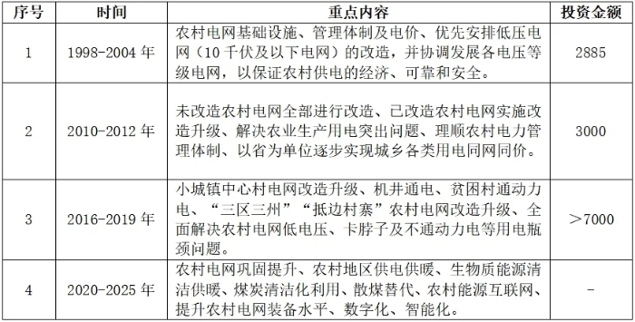 農(nóng)村電網(wǎng)改造升級(jí)是推動(dòng)鄉(xiāng)村振興戰(zhàn)略落地實(shí)施的重要抓手之一,農(nóng)村電網(wǎng)的改造升級(jí)能更好地滿足農(nóng)村居民美好生活需要的內(nèi)在要求,提升農(nóng)村地區(qū)電力保障水平,推進(jìn)城鄉(xiāng)電力服務(wù)均等化,推動(dòng)構(gòu)建農(nóng)村新型能源體系,對(duì)鞏固拓展脫貧攻堅(jiān)成果、促進(jìn)鄉(xiāng)村振興具有重要意義。我國自1998年實(shí)施第一輪農(nóng)村電網(wǎng)改造升級(jí)以來,農(nóng)村電網(wǎng)改造升級(jí)成效顯著。