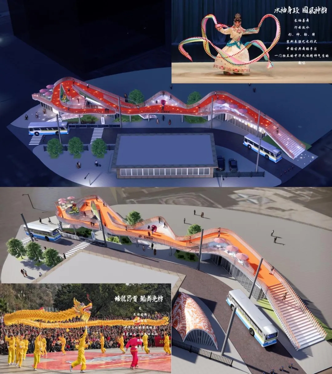 為了在地處首都風(fēng)貌協(xié)調(diào)區(qū)的現(xiàn)代化都市環(huán)境里,彰顯文化自信,場(chǎng)站整體形象把握上,定下了在現(xiàn)代設(shè)計(jì)語(yǔ)言中蘊(yùn)含文化元素的基調(diào)。面對(duì)狹長(zhǎng)地形與服務(wù)用房的高差,將不利因素轉(zhuǎn)化為設(shè)計(jì)條件,屋面平臺(tái)隨形就勢(shì),形態(tài)特征與中國(guó)京劇表現(xiàn)形式—“水袖”的婉轉(zhuǎn)流動(dòng)的不謀而合;增建部分的色彩使用明亮、動(dòng)感的漸變亮橙色,如京劇服飾色彩隨動(dòng)作呈現(xiàn)變化。希望打造提升整個(gè)地塊形象氣質(zhì)的不同以往的場(chǎng)站形象,吸引聚集人氣。