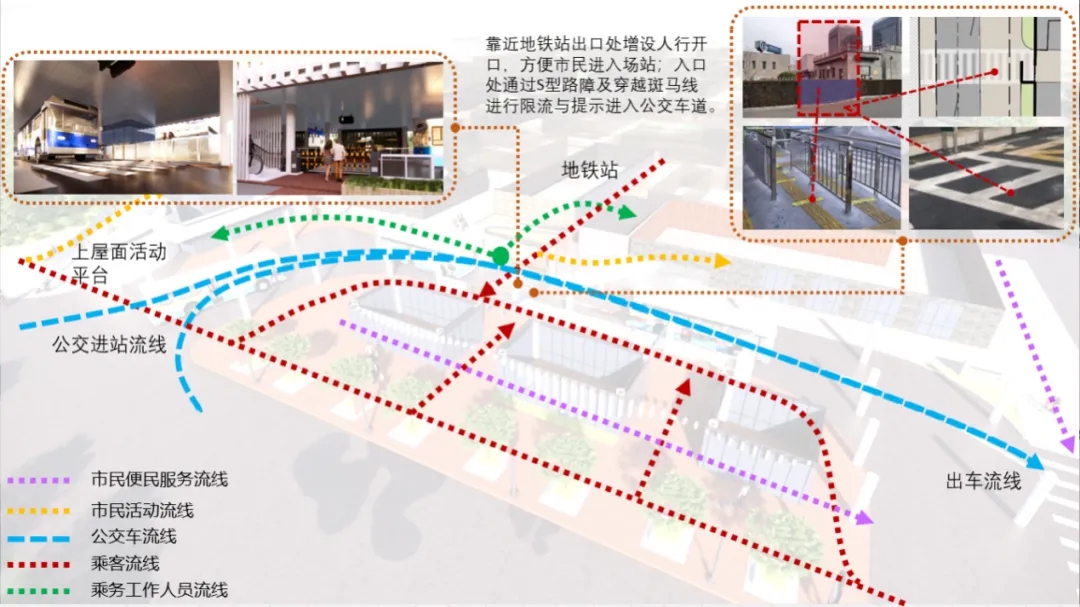 場(chǎng)站內(nèi)部交通流線的梳理,打破原有場(chǎng)站邊界,從出地鐵站口增設(shè)人行開(kāi)口方便換乘、過(guò)站市民進(jìn)入。與公交車行道交叉處通過(guò)S型路障、鋪設(shè)斑馬線等措施進(jìn)行限流與提示,解決原場(chǎng)站阻礙換乘人流的問(wèn)題。