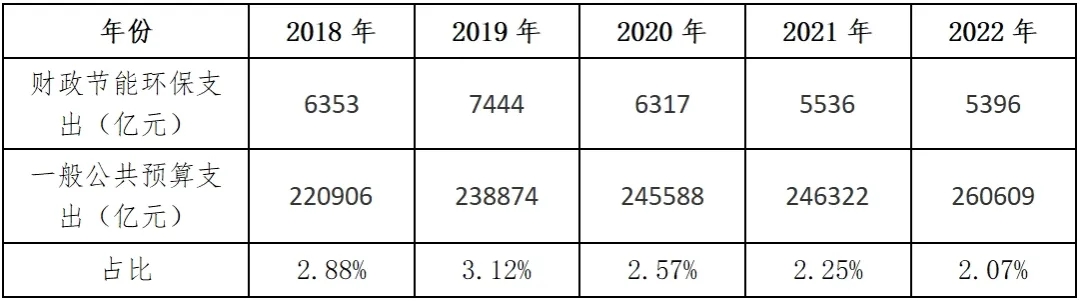 表1 2018年-2022年全國(guó)一般公共預(yù)算支出中節(jié)能環(huán)保支出及占比情況