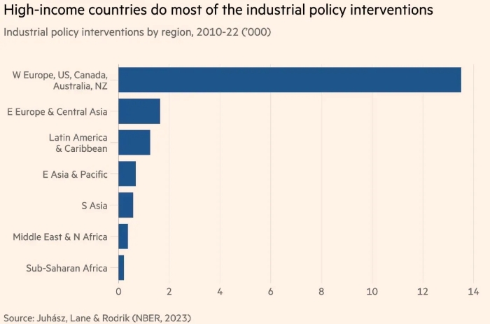 有證據(jù)表明,產(chǎn)業(yè)政策作為一種理念和實踐都變得更加普遍。國際貨幣基金組織去年 1 月發(fā)布的《產(chǎn)業(yè)政策回歸數(shù)據(jù)》顯示,過去十年,商業(yè)媒體中對產(chǎn)業(yè)政策的提及顯著增加。美國國家經(jīng)濟研究局發(fā)表的一篇關(guān)于《產(chǎn)業(yè)政策的新經(jīng)濟學(xué)》的論文由雷卡·尤哈斯、內(nèi)森·萊恩和丹尼·羅德里克共同撰寫,論文顯示,全球產(chǎn)業(yè)政策干預(yù)措施急劇增加,從2017年的228項增加到2022年的1568項——主要是在高收入國家(可能是因為它們有更多的財政空間)。這也讓世界其他國家指責(zé)它們虛偽。(見圖1)